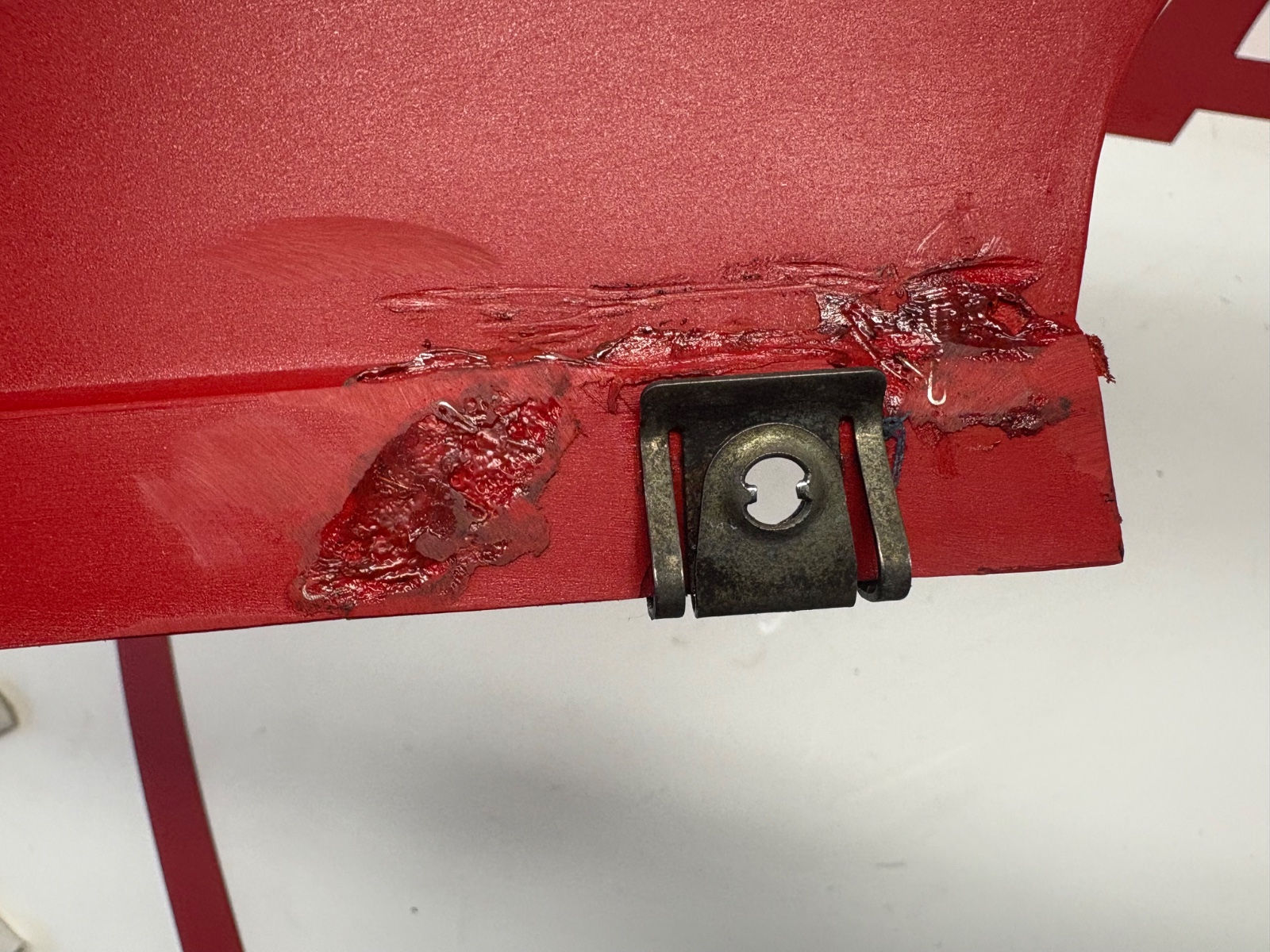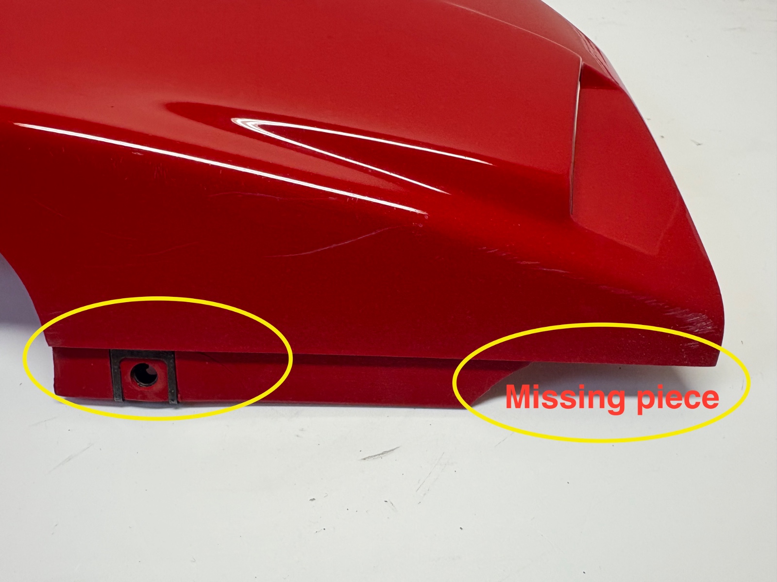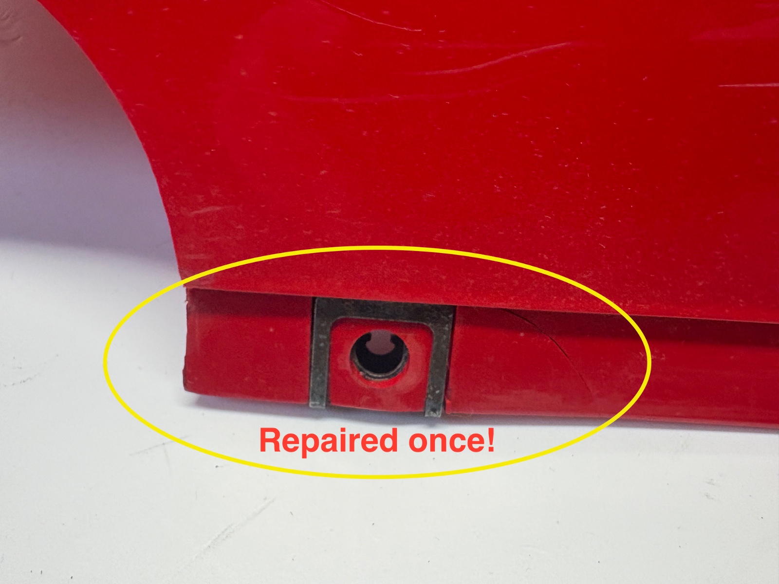 Repaired once, missing small piece ( mounting point) at the front end!